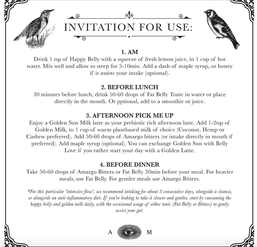 Amargo Bitters: Our digestive bitters are different than the classic bitters you find, as its composed of medicinal herbs known to greatly assist the gut in a myriad of ways. Composed of potent botanical treasures, also known for their prebiotic effects, such as Quassia, Dandelion, Burdock, Lemon Peel, Milk Thistle, Oregon Grape Root, Mugwort and fresh Ginger. All which are renowned to support the blood, digestion, detox and mineralization.*