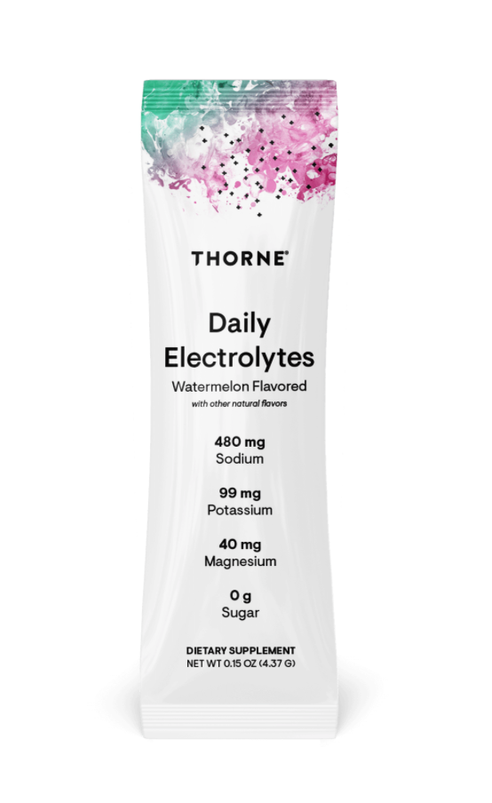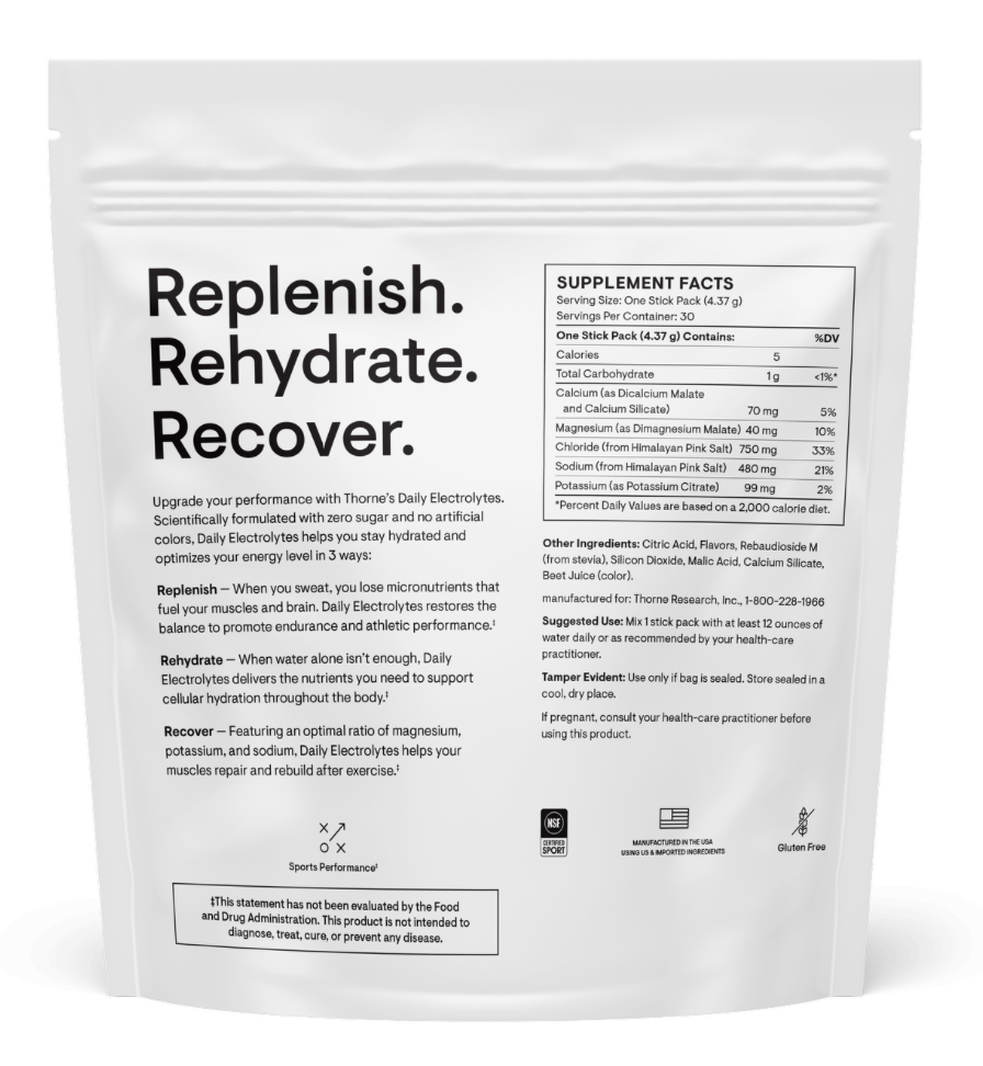 Promote healthy cellular hydration and boost recovery with Thorne’s Daily Electrolytes. Optimal cellular hydration and electrolyte balance supports cellular energy production, benefits cell signaling, and enhances muscle performance, helping you reach new heights, one sip at a time.* Because the body loses water and essential minerals through sweat – including sodium, potassium, magnesium, calcium, and chloride – replenishing those nutrients that are lost is an essential step to think, perform, and feel your best.* Daily Electrolytes are packaged in convenient stick packs to take with you to the gym, the great outdoors, or across the globe.