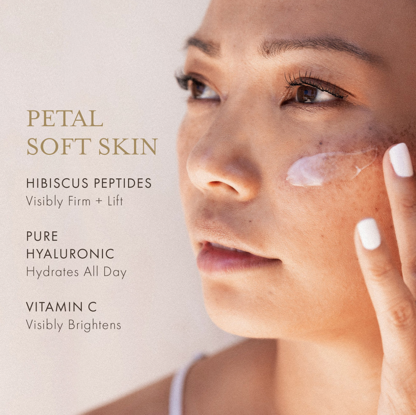 Lightweight and ultra softening, Hydrating Petal Cream is your silkiest daily moisturizer inspired by flower petals and their ability to retain beauty through deep hydration. Flower essences deliver a bouquet of nutrients while Hyaluronic Acid and Hibiscus Peptides drench the skin with elastin-boosting and anti-aging benefits.