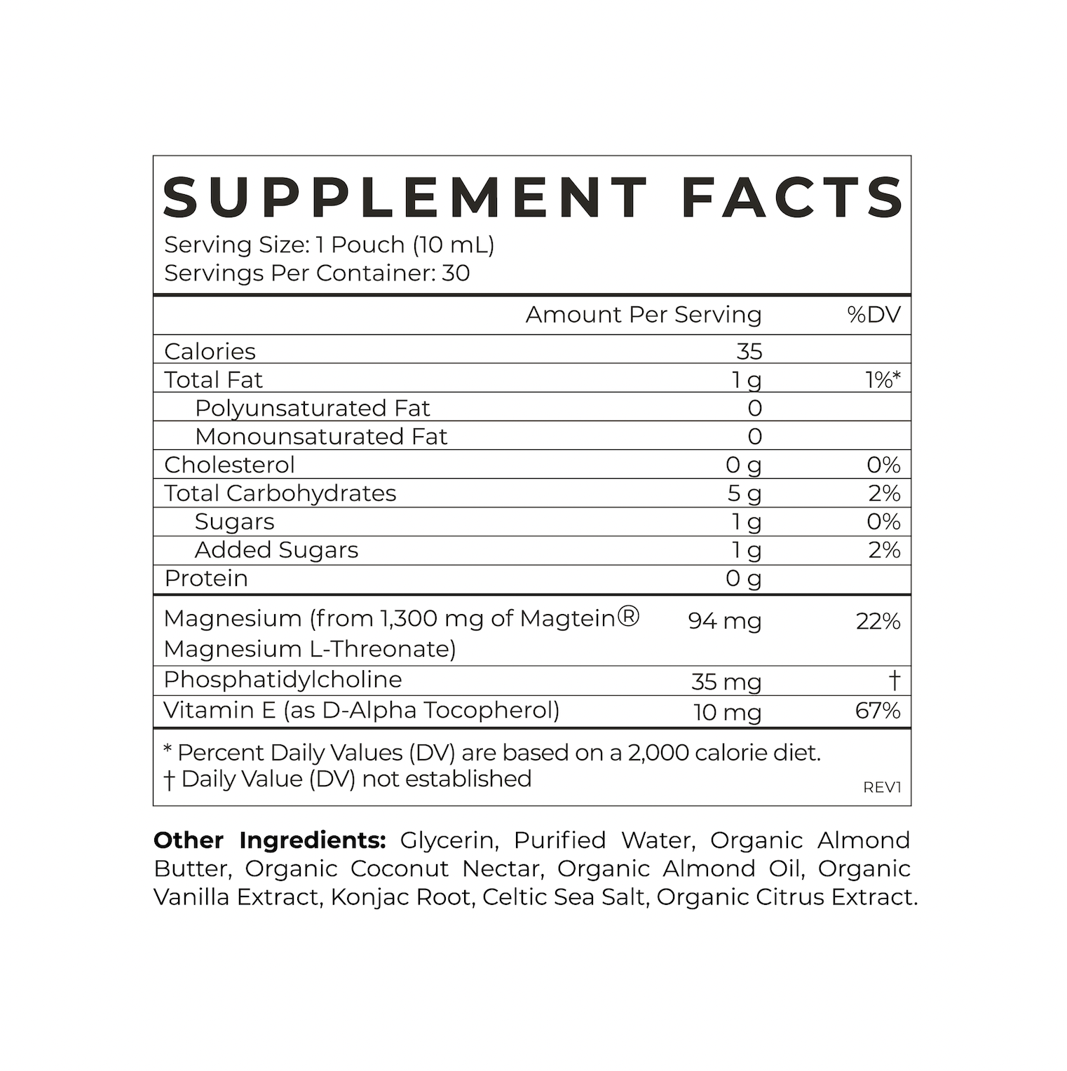 Magnesium (from 1,300mg of Magtein® Magnesium L-Threonate), Phosphatidylcholine, Vitamin E (as D-Alpha Tocopherol)